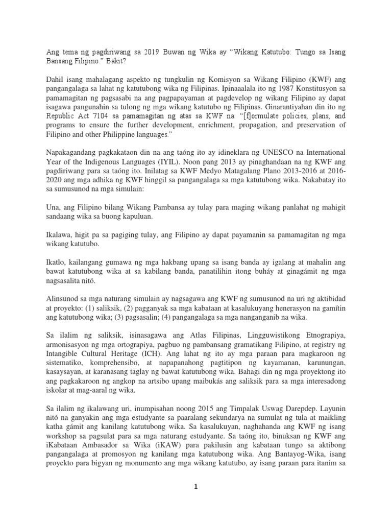 Palawakin o paunlarin ang unawa tungkol sa wikang Filipino. Sa paglaganap ng mga ibat ibang wika nakaklimutan na natin ang ating wika hindi na natin ito binibigyan ng importansya at parang wala nalang ito sa kahalagahan sa ating buhay. Bilang kabataan paano mo maipapakita ang iyong pagpapahalaga at pagmamalaki sa wikang filipino at katitubong wikang ginagamit sa lugar na iyong.